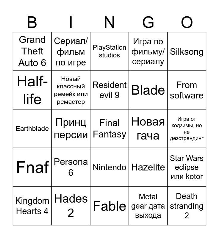 This bingo card has a free space and 24 words: Kingdom Hearts 4, Persona 6, Resident evil 9, Metal gear дата выхода, Silksong, Grand Theft Auto 6, Сериал/фильм по игре, PlayStation studios, Новая гача, Игра от кодзимы, но не дезстрендинг, Earthblade, Новый классный ремейк или ремастер, Hazelite, Star Wars eclipse или kotor, Half-life, Hades 2, Fable, Игра по фильму/сериалу, From software, Fnaf, Принц персии, Nintendo, Blade and Death stranding 2.
