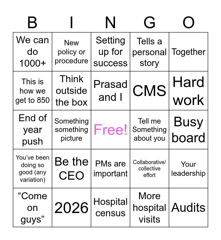 This bingo card has a free space and 29 words: “Come on guys”, Teamwork, Something something picture, Big deal about remembering a name, We can do 1000+, Setting up for success, Think outside the box, Be the CEO, Tell me Something about you, 2026, Busy board, Audits, Hospital census, More hospital visits, Hard work, Tracking, PMs are important, You’ve been doing so good (any variation), Together, End of year push, Collaborative/ collective effort, Increase journaling, CMS, This is how we get to 850, Tells a personal story, New policy or procedure, Your leadership, Prasad and I and Employee appreciation night.