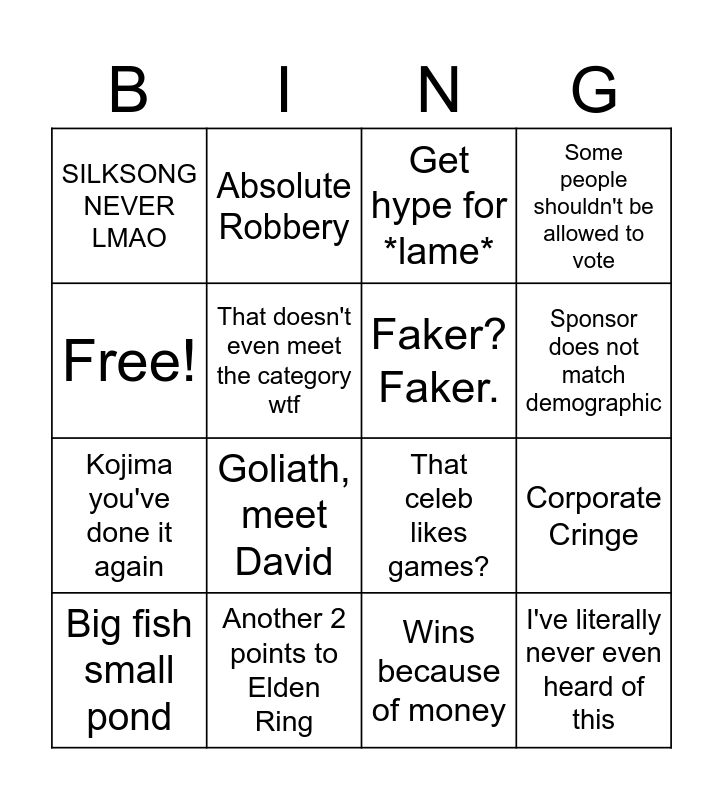 This bingo card has 16 words: Another 2 points to Elden Ring, Corporate Cringe, Get hype for *lame*, SILKSONG NEVER LMAO, Kojima you've done it again, Absolute Robbery, That celeb likes games?, Wins because of money, Free!, That doesn't even meet the category wtf, Big fish small pond, Some people shouldn't be allowed to vote, Goliath, meet David, Sponsor does not match demographic, Faker? Faker. and I've literally never even heard of this.
