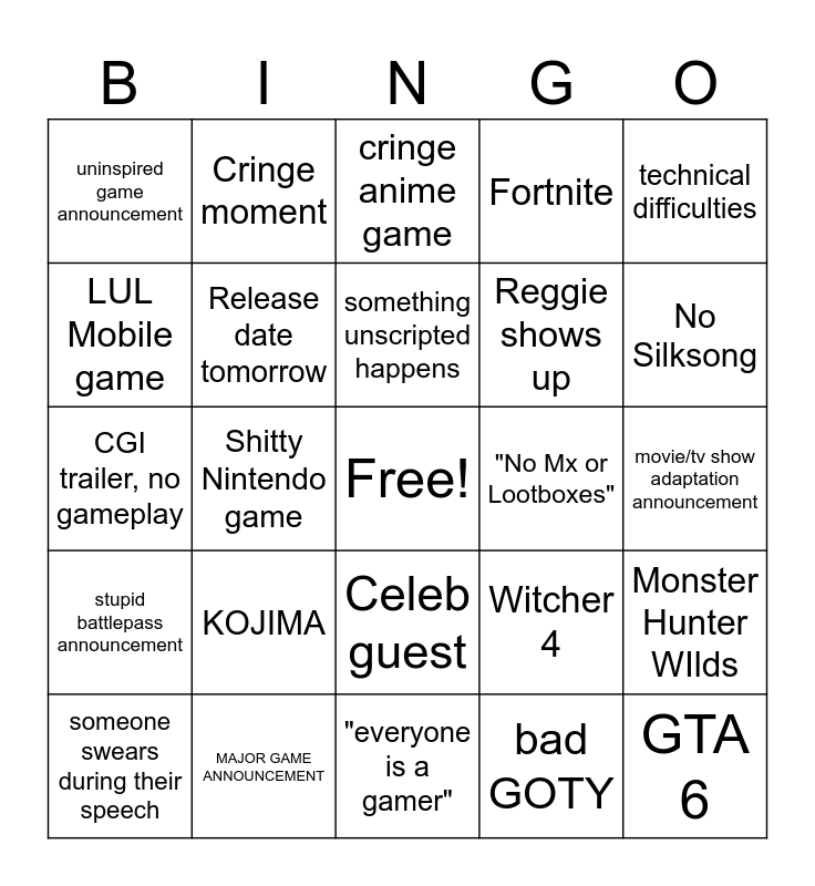 This bingo card has a free space and 24 words: KOJIMA, MAJOR GAME ANNOUNCEMENT, something unscripted happens, someone swears during their speech, technical difficulties, uninspired game announcement, LUL Mobile game, Cringe moment, "No Mx or Lootboxes", Celeb guest, Reggie shows up, CGI trailer, no gameplay, Witcher 4, Monster Hunter WIlds, Release date tomorrow, bad GOTY, movie/tv show adaptation announcement, cringe anime game, No Silksong, Shitty Nintendo game, GTA 6, stupid battlepass announcement, Fortnite and "everyone is a gamer".