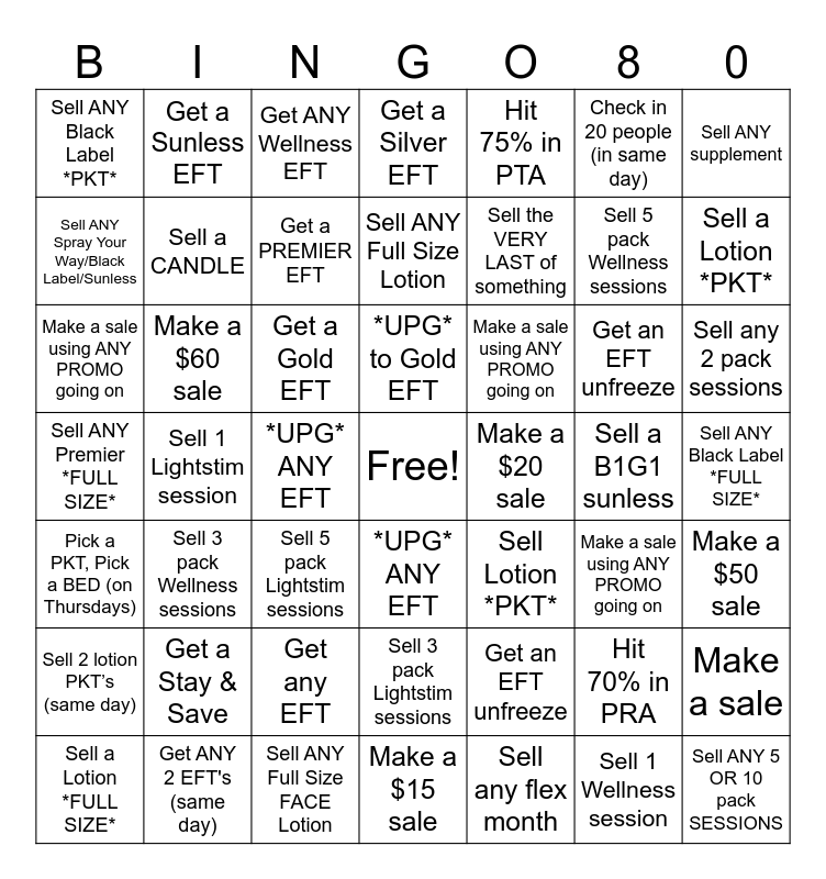 This bingo card has a free space and 101 words: Hit 70% in PTA, Hit 70% in PRA, Hit 75% in PTA, Hit 75% in PRA, Hit 80% in PTA, Hit 80% in PRA, Hit 90% in PTA, Hit 90% in PRA, Hit 100% in PTA, Hit 100 % in PRA, Check in 5 people (in same day), Make a $10 sale, Make a $15 sale, Make a $20 sale, Make a $40 sale, Make a $50 sale, Make a $60 sale, Make a $70 sale, Make a $80 sale, Make a $90 sale, Make a $100+ sale, Make a $150 sale, Make a sale, Check in 10people (in same day), Get any EFT, Get a PREMIER EFT, Get a Silver EFT, Get a Gold EFT, Get a Platinum EFT, Get a Diamond EFT, Get a Sunless EFT, Get ANY Wellness EFT, Get a Wellness PLUS EFT, Get ANY 2 EFT's (same day), *UPG* ANY EFT, *UPG* to Gold EFT, *UPG* to Platinum EFT, *UPG* to Diamond EFT, *UPG* ANY EFT, Sell 1 Lightstim session, Sell 1 Wellness session, Sell any 2 pack sessions, Sell 3 pack Lightstim sessions, Sell 3 pack Wellness sessions, Sell 5 pack Lightstim sessions, Sell 5 pack Wellness sessions, Sell $10 Wellness session (Wednesdays), Pick a PKT, Pick a BED (on Thursdays), Sell ANY 5 OR 10 pack SESSIONS, Sell ANY 5 OR 10 pack SESSIONS, Sell 1 sunless/spray, Check in 20 people (in same day), Sell a B1G1 sunless, Sell a spray w/ 1+ addies, Sell a spray w/ 2+ addies, Sell a spray w/ 3+ addies, Sell 1 (or more) addies, Sell 2+ addies, Sell 3+ addies, Sell any flex month, Sell ANY supplement, Sell a Lightstim sheet mask, Sell 3pk/box Lightstim sheet mask, Sell Lβobsidiennex, Sell City Lips, Sell a CANDLE, Sell any TELETIES, Sell the VERY LAST of something, Sell ANY Premier *FULL SIZE*, Sell ANY Premier *PKT*, Sell ANY Premier *PKT/FULL SIZE*, Sell ANY Black Label *FULL SIZE*, Sell ANY Black Label *PKT*, Sell ANY Black Label *PKT/FULL SIZE*, Sell ANY Spray Your Way/Black Label/Sunless, Sell ANY Full Size Lotion, Sell ANY Full Size FACE Lotion, Sell ANY RESTORED product, Sell ANY Tan Extender, Sell a Lotion *FULL SIZE*, Sell a Lotion *PKT*, Sell an Lotion *FULL SIZE*, Sell a Lotion *PKT*, Sell a Lotion *FULL SIZE*, Sell Lotion *PKT*, Sell 2 lotion PKTβs (same day), Make a sale using ANY PROMO going on, Make a sale using ANY PROMO going on, Make a sale using ANY PROMO going on, Make a sale using ANY PROMO going on, Make a sale using ANY PROMO going on, Make a sale using ANY PROMO going on, Make a sale using ANY PROMO going on, Get an EFT unfreeze, Get an EFT unfreeze, Get an EFT unfreeze, Get an EFT unfreeze, Get a Stay & Save, Get a Stay & Save, Get a Stay & Save and Get a Stay & Save.