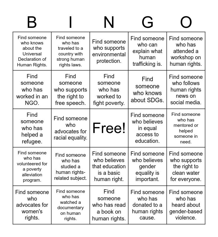 This bingo card has a free space and 27 words: Find someone who believes gender equality is important., Find someone who has participated in a charity event., Find someone who knows about SDGs., Find someone who has read a book on human rights., Find someone who has worked in an NGO., Find someone who supports environmental protection., Find someone who has traveled to a country with strong human rights laws., Find someone who has volunteered for a poverty alleviation program., Find someone who believes in equal access to education., Find someone who supports the right to clean water for everyone., Find someone who has helped a refugee., Find someone who can explain what human trafficking is., Find someone who advocates for women's rights., Find someone who has watched a documentary on human rights., Find someone who follows human rights news on social media., Find someone who has been involved in a protest for social justice., Find someone who supports the right to free speech., Find someone who has worked to fight poverty., Find someone who has studied a human rights-related subject., Find someone who knows about the Universal Declaration of Human Rights., Find someone who has mentored or helped someone in need., Find someone who has donated to a human rights cause., Find someone who advocates for racial equality., Find someone who has heard about gender-based violence., Find someone who believes that education is a basic human right., Find someone who has attended a workshop on human rights. and Find someone who supports disability rights..