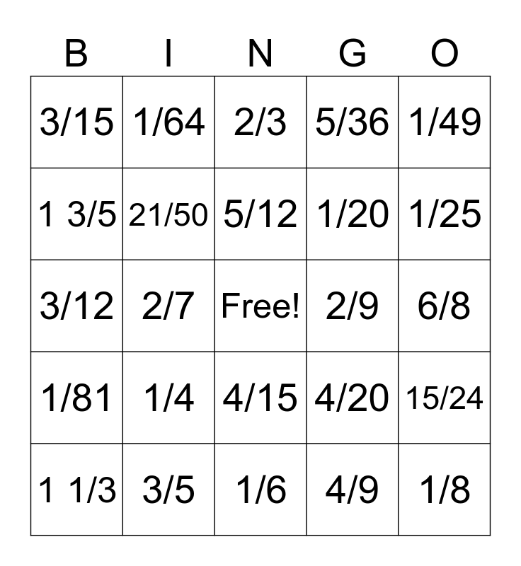 This bingo card has a free space and 24 words: 1/4, 3/5, 5/12, 1 1/3, 1/49, 3/15, 1 3/5, 1/64, 2/9, 4/15, 1/20, 3/12, 4/20, 15/24, 21/50, 4/9, 6/8, 2/3, 1/25, 2/7, 1/8, 1/81, 5/36 and 1/6.