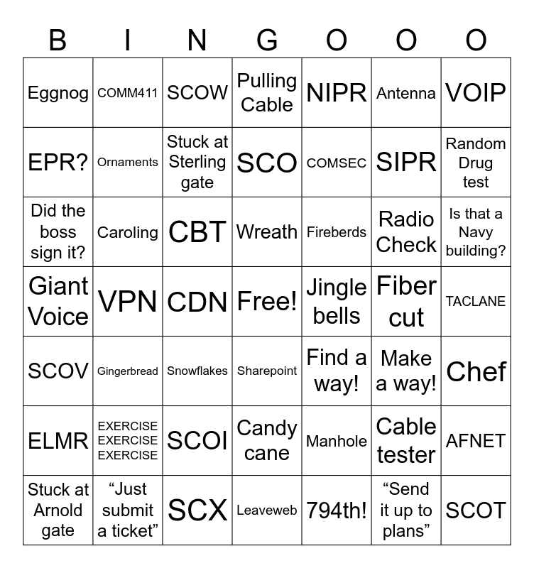 This bingo card has a free space and 48 words: Manhole, SIPR, Leaveweb, VPN, CBT, TACLANE, COMM411, “Just submit a ticket”, Antenna, Sharepoint, VOIP, Pulling Cable, Radio Check, Fireberds, ELMR, Fiber cut, EPR?, Random Drug test, Cable tester, NIPR, COMSEC, CDN, Eggnog, Ornaments, AFNET, Stuck at Sterling gate, Is that a Navy building?, Stuck at Arnold gate, Wreath, Caroling, “Send it up to plans”, Jingle bells, Chef, EXERCISE EXERCISE EXERCISE, Giant Voice, Find a way!, Make a way!, Did the boss sign it?, Snowflakes, SCOI, SCOV, SCOT, SCOW, SCX, SCO, Candy cane, Gingerbread and 794th!.