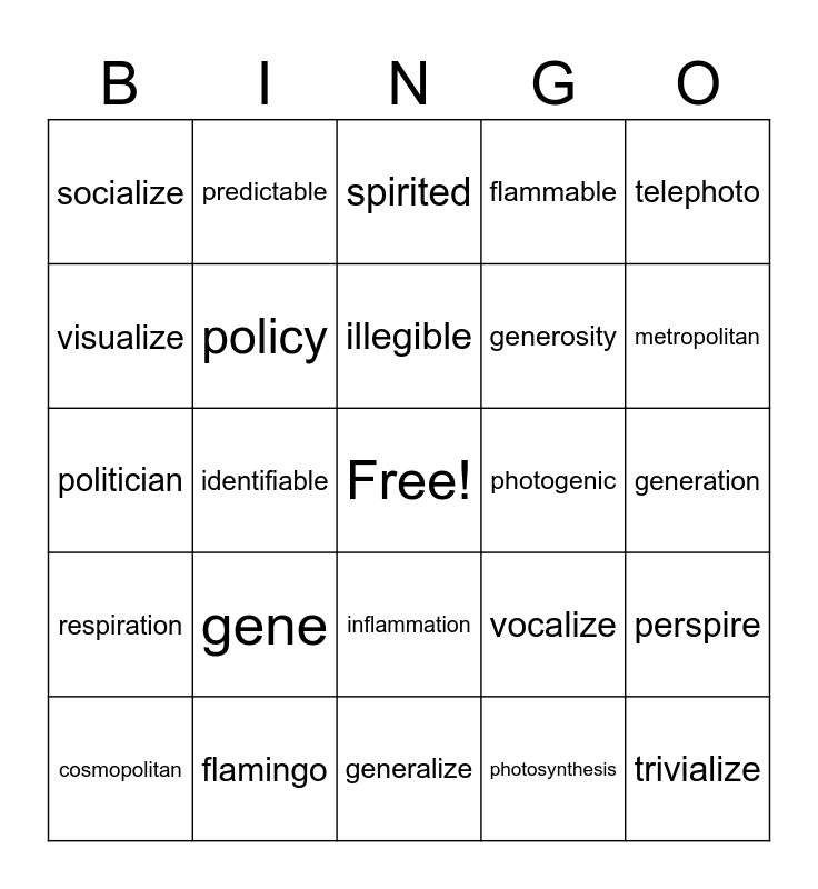 This bingo card has a free space and 27 words: vocalize, international, generosity, generalize, visualize, spirited, predictable, respiration, photogenic, perspire, politician, flammable, cosmopolitan, flamingo, metropolitan, nationality, policy, illegible, gene, socialize, generation, photosynthesis, identifiable, trivialize, inflammation, telephoto and horrible.