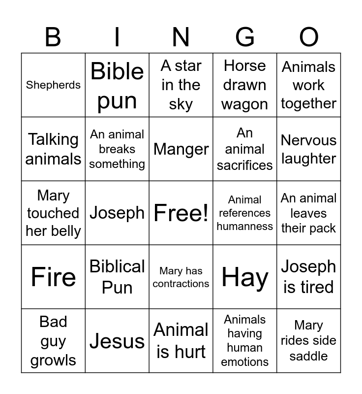 This bingo card has a free space and 24 words: Biblical Pun, Jesus, Manger, Bad guy growls, Animals work together, Shepherds, Talking animals, Bible pun, Animal references humanness, Mary has contractions, An animal sacrifices, Mary touched her belly, Hay, Joseph is tired, An animal breaks something, Animals having human emotions, An animal leaves their pack, A star in the sky, Nervous laughter, Joseph, Mary rides side saddle, Fire, Horse drawn wagon and Animal is hurt.