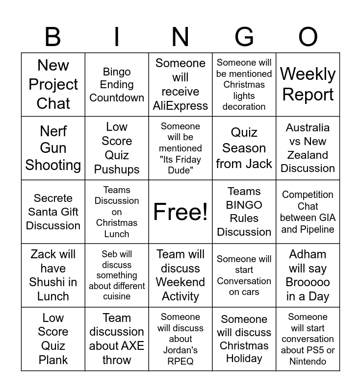 This bingo card has a free space and 24 words: Seb will discuss something about different cuisine, Team discussion about AXE throw, Someone will be mentioned "Its Friday Dude", Low Score Quiz Plank, Weekly Report, New Project Chat, Nerf Gun Shooting, Bingo Ending Countdown, Teams BINGO Rules Discussion, Team will discuss Weekend Activity, Quiz Season from Jack, Secrete Santa Gift Discussion, Someone will start Conversation on cars, Adham will say Brooooo in a Day, Low Score Quiz Pushups, Someone will discuss Christmas Holiday, Competition Chat between GIA and Pipeline, Someone will receive AliExpress, Australia vs New Zealand Discussion, Teams Discussion on Christmas Lunch, Someone will start conversation about PS5 or Nintendo, Zack will have Shushi in Lunch, Someone will be mentioned Christmas lights decoration and Someone will discuss about Jordan's RPEQ.