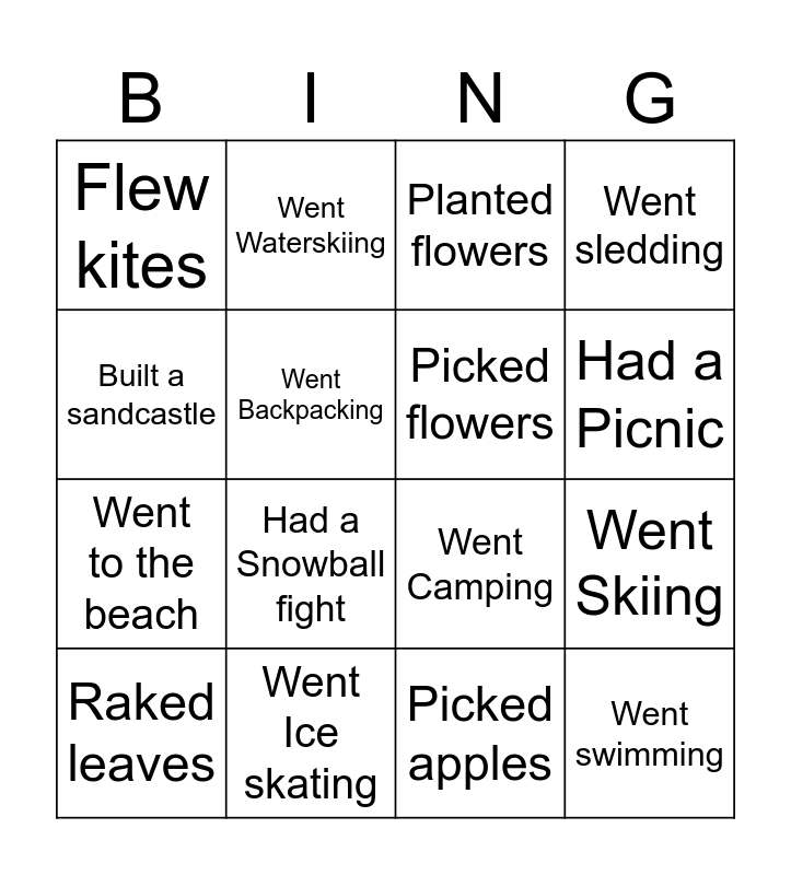 This bingo card has 16 words: Went Ice skating, Went Skiing, Planted flowers, Flew kites, Went to the beach, Went Waterskiing, Went Camping, Picked apples, Built a sandcastle, Went Backpacking, Raked leaves, Went sledding, Had a Snowball fight, Had a Picnic, Picked flowers and Went swimming.