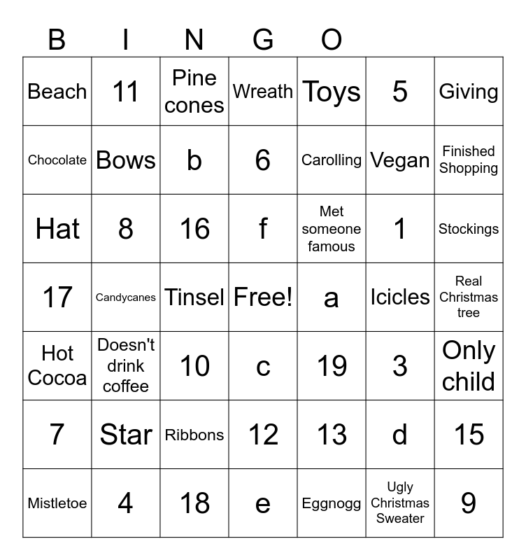 This bingo card has a free space and 55 words: Eggnogg, Stockings, Holly, Beach, Candycanes, Star, Giving, Candles, Bows, Ribbons, Wreath, Only child, Real Christmas tree, Icicles, Mistletoe, Hot Cocoa, Toys, Carolling, Ugly Christmas Sweater, Vegan, Finished Shopping, Doesn't drink coffee, Met someone famous, Pine cones, Baubles, Chocolate, Tinsel, Bells, Hat, 1, 2, 3, 15, 4, 5, 6, 7, 8, 9, 10, 11, 12, 13, 14, 16, 17, 18, 19, a, b, c, d, e, f and g.