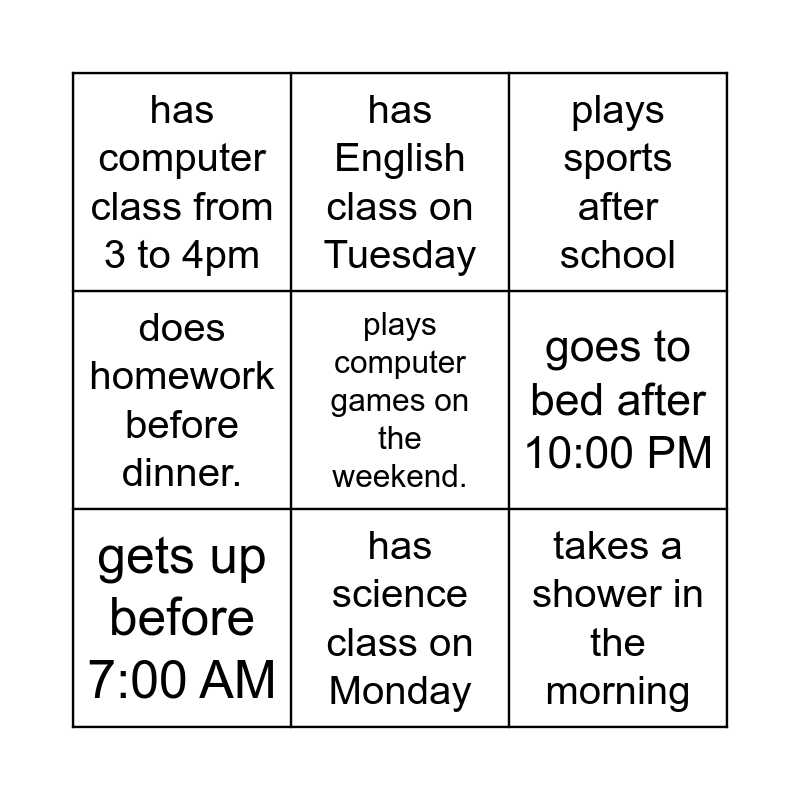 This bingo card has 9 words: gets up before 7:00 AM, plays sports after school, has English class on Tuesday, does homework before dinner., has computer class from 3 to 4pm, goes to bed after 10:00 PM, plays computer games on the weekend., takes a shower in the morning and has science class on Monday.