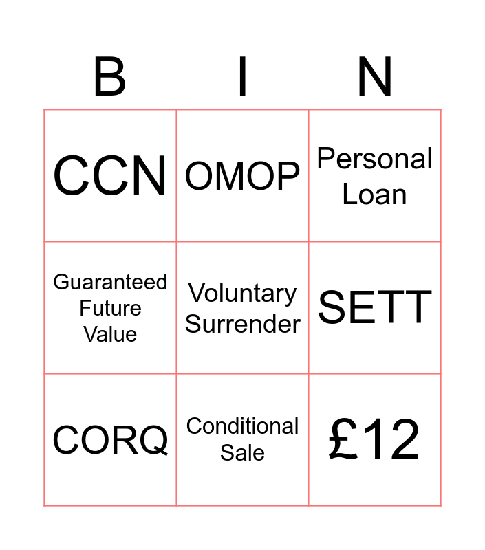 This bingo card has a free space and 8 words: SETT, Personal Loan, OMOP, CORQ, CCN, £12, Guaranteed Future Value and Conditional Sale.