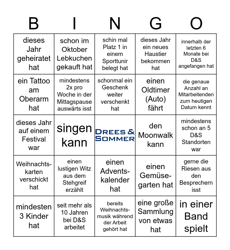 This bingo card has a free space and 24 words: einen lustigen Witz aus dem Stehgreif erzählt, seit mehr als 10 Jahren bei D&S arbeitet, schonmal ein Geschenk weiter verschenkt hat, mindesten 3 Kinder hat, innerhalb der letzten 6 Monate bei D&S angefangen hat, dieses Jahr geheiratet hat, ein Tattoo am Oberarm hat, schon im Oktober Lebkuchen gekauft hat, den Moonwalk kann, einen Advents-kalender hat, einen Oldtimer (Auto) fährt, dieses Jahr auf einem Festival war, einen Gemüse-garten hat, gerne die Riesen aus den Besprechern isst, mindestens 2x pro Woche in der Mittagspause auswärts isst, eine große Sammlung von etwas hat, mindestens schon an 5 D&S Standorten war, schin mal Platz 1 in einem Sporttunir belegt hat, die genaue Anzahl an Mitarbeitenden zum heutigen Datum kennt, singen kann, in einer Band spielt, Weihnachts-karten verschickt hat, dieses Jahr ein neues Haustier bekommen hat and bereits Weihnachts- musik während der Arbeit gehört hat.
