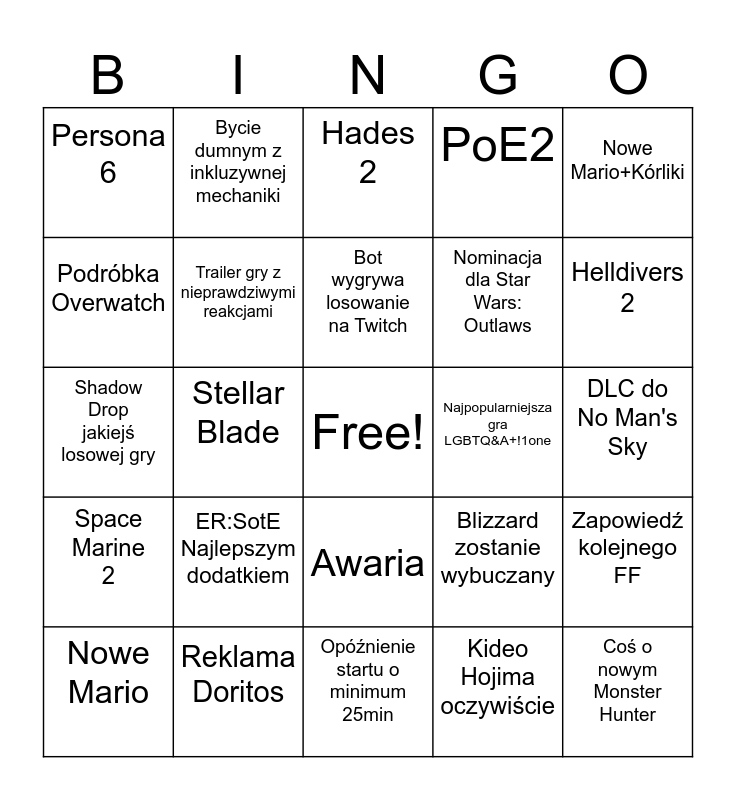 This bingo card has a free space and 24 words: ER:SotE Najlepszym dodatkiem, Reklama Doritos, Bot wygrywa losowanie na Twitch, Nowe Mario, Nowe Mario+Kórliki, Persona 6, Podróbka Overwatch, Bycie dumnym z inkluzywnej mechaniki, Najpopularniejsza gra LGBTQ&A+!1one, Awaria, Nominacja dla Star Wars: Outlaws, Shadow Drop jakiejś losowej gry, Blizzard zostanie wybuczany, Zapowiedź kolejnego FF, Trailer gry z nieprawdziwymi reakcjami, Kideo Hojima oczywiście, DLC do No Man's Sky, Hades 2, Helldivers 2, Stellar Blade, Coś o nowym Monster Hunter, Space Marine 2, PoE2 and Opóźnienie startu o minimum 25min.