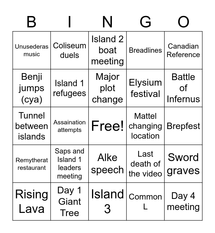 This bingo card has a free space and 44 words: Mattel wedding, Day 4 meeting, Sculk Cult, Rising Lava, Boiling water, Common L, Island 2 boat meeting, Gerald the mooshroom, Canadian Reference, Day 1 Giant Tree, Breadlines, Mattel changing location, Alke speech, Saps and Island 1 leaders meeting, awobbuffet death in general, Island 3, Island 1 complaining, Tunnel between islands, Southern Alliance, Battle of Infernus, Coliseum duels, Failed trials, Daybreak news, Unusederas music, Newkids, Brepfest, Woodaddy death, First death, Last death of the video, Remytherat restaurant, Pirates in general, Sword graves, Franit, Aperion Bees, Assaination attempts, Lingulini, Sponsor on the video, Among us, Major plot change, Benji jumps (cya), Elysium festival, Nevermore coup, Island 1 refugees and Solev contracts.
