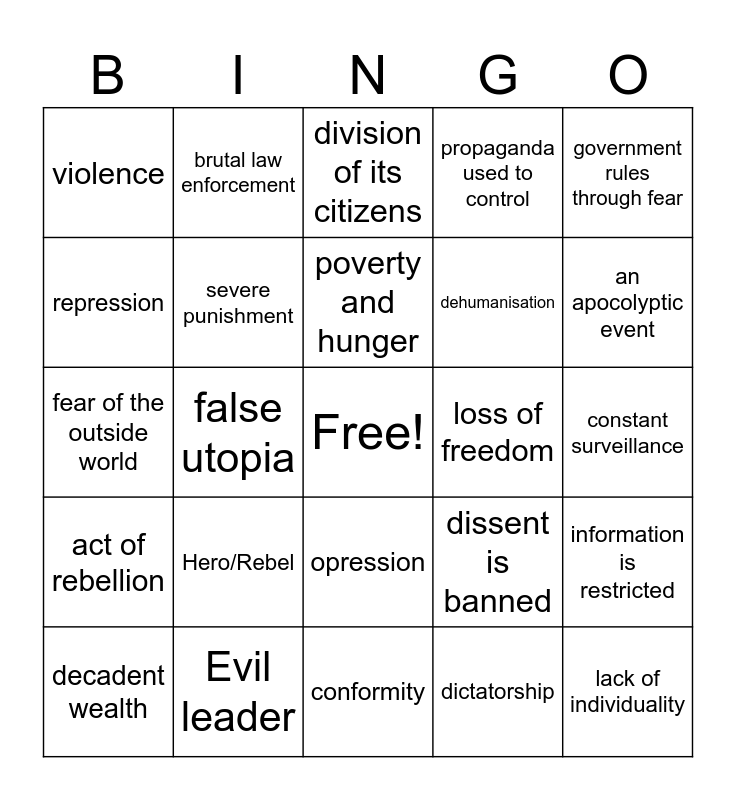 This bingo card has a free space and 24 words: Hero/Rebel, Evil leader, poverty and hunger, decadent wealth, government rules through fear, violence, repression, brutal law enforcement, loss of freedom, opression, dehumanisation, fear of the outside world, dissent is banned, information is restricted, severe punishment, dictatorship, constant surveillance, division of its citizens, an apocolyptic event, false utopia, lack of individuality, act of rebellion, propaganda used to control and conformity.
