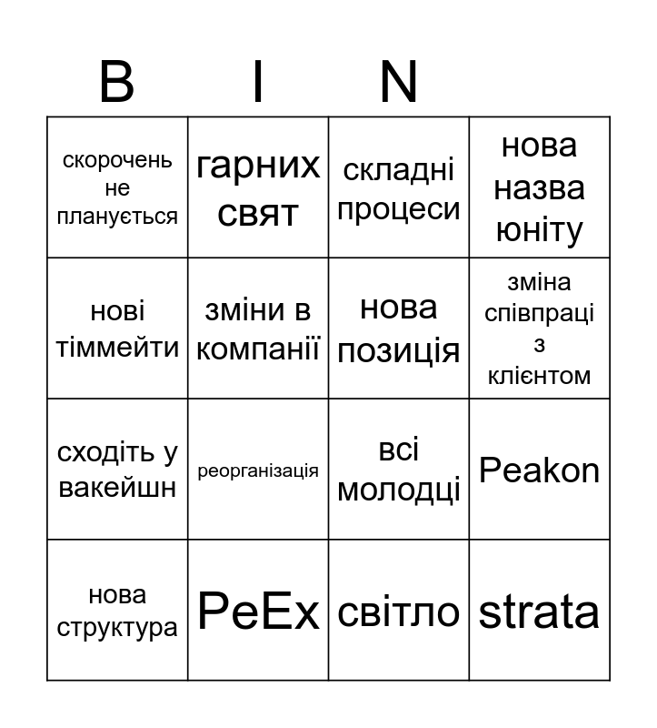 This bingo card has 16 words: PeEx, Peakon, складні процеси, скорочень не планується, сходіть у вакейшн, гарних свят, всі молодці, світло, нові тіммейти, зміни в компанії, нова структура, нова назва юніту, реорганізація, зміна співпраці з клієнтом, нова позиція and strata.