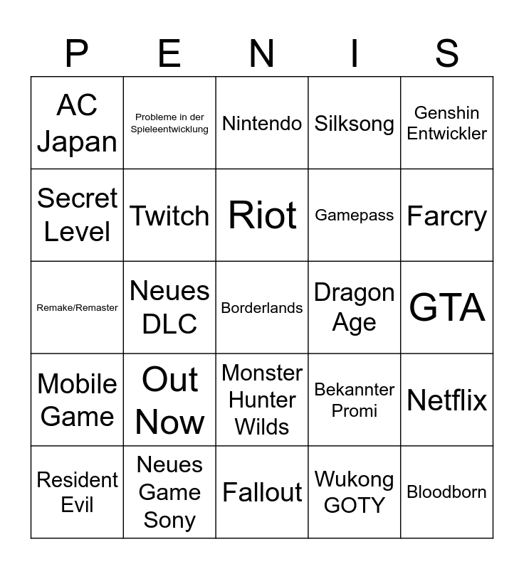 This bingo card has a free space and 24 words: Out Now, Neues Game Sony, Riot, Resident Evil, Genshin Entwickler, AC Japan, Secret Level, Probleme in der Spieleentwicklung, Dragon Age, Monster Hunter Wilds, Gamepass, Remake/Remaster, Bekannter Promi, Netflix, Twitch, Wukong GOTY, GTA, Nintendo, Farcry, Neues DLC, Bloodborn, Mobile Game, Silksong and Fallout.