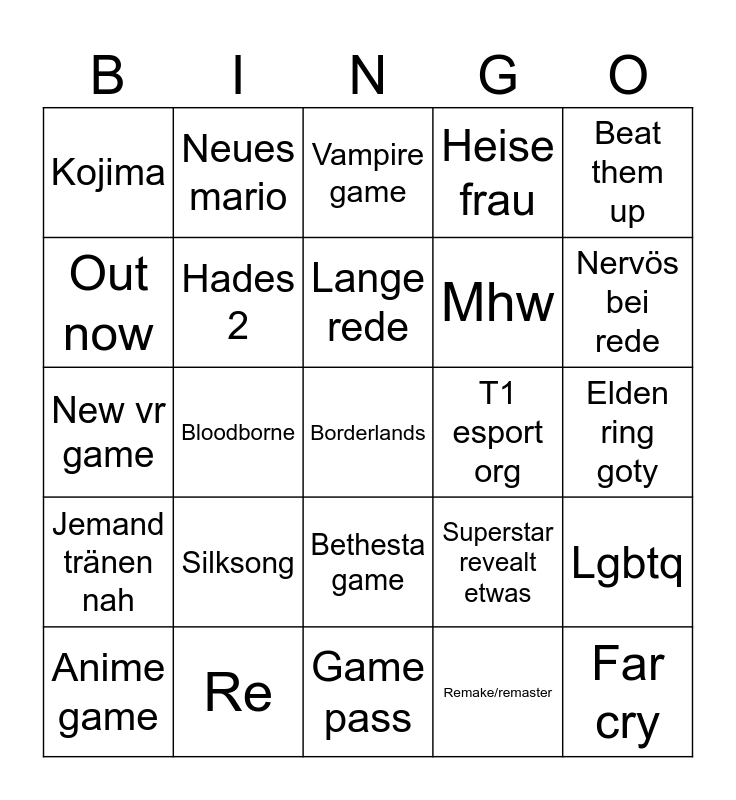 This bingo card has a free space and 24 words: Silksong, Re, Lange rede, Anime game, Beat them up, Kojima, Out now, Neues mario, T1 esport org, Bethesta game, Mhw, New vr game, Superstar revealt etwas, Lgbtq, Hades 2, Remake/remaster, Elden ring goty, Vampire game, Nervös bei rede, Bloodborne, Far cry, Jemand tränen nah, Heise frau and Game pass.