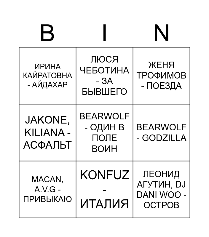 This bingo card has 16 words: ГИО ПИКА, MIRAVI - МИР, ДЖИГАН, ARTIK & ASTI, NILETTO - ХУДИ, ЖЕНЯ ТРОФИМОВ - ПОЕЗДА, ИРИНА КАЙРАТОВНА - АЙДАХАР, ЛЕОНИД АГУТИН, DJ DANI WOO - ОСТРОВ, ЛЮСЯ ЧЕБОТИНА - ЗА БЫВШЕГО, МОЯ МИШЕЛЬ - ЗИМА В СЕРДЦЕ, ТРИ ДНЯ ДОЖДЯ, MONA - ПРОЩАНИЕ, BEARWOLF - ОДИН В ПОЛЕ ВОИН, BEARWOLF - GODZILLA, BIG BABY TAPE, AARNE - SUPERSONIC, JAKONE, KILIANA - АСФАЛЬТ, JAKONE, SCIRENA - ПО ВЕСНЕ, KONFUZ - ИТАЛИЯ, MACAN, A.V.G - ПРИВЫКАЮ and WALLEM - ХАРИЗМА.