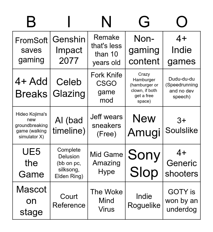 This bingo card has a free space and 24 words: Complete Delusion (bb on pc, silksong, Elden Ring), Court Reference, Fork Knife CSGO game mod, Mascot on stage, 4+ Indie games, FromSoft saves gaming, 4+ Add Breaks, Genshin Impact 2077, New Amugi, Mid Game Amazing Hype, Crazy Hamburger (hamburger or clown, if both get a free space), Hideo Kojima's new groundbreaking game (walking simulator X), Sony Slop, 4+ Generic shooters, Celeb Glazing, Indie Roguelike, 3+ Soulslike, Remake that's less than 10 years old, Dudu-du-du (Speedrunning and no dev speech), AI (bad timeline), GOTY is won by an underdog, UE5 the Game, Non-gaming content and The Woke Mind Virus.