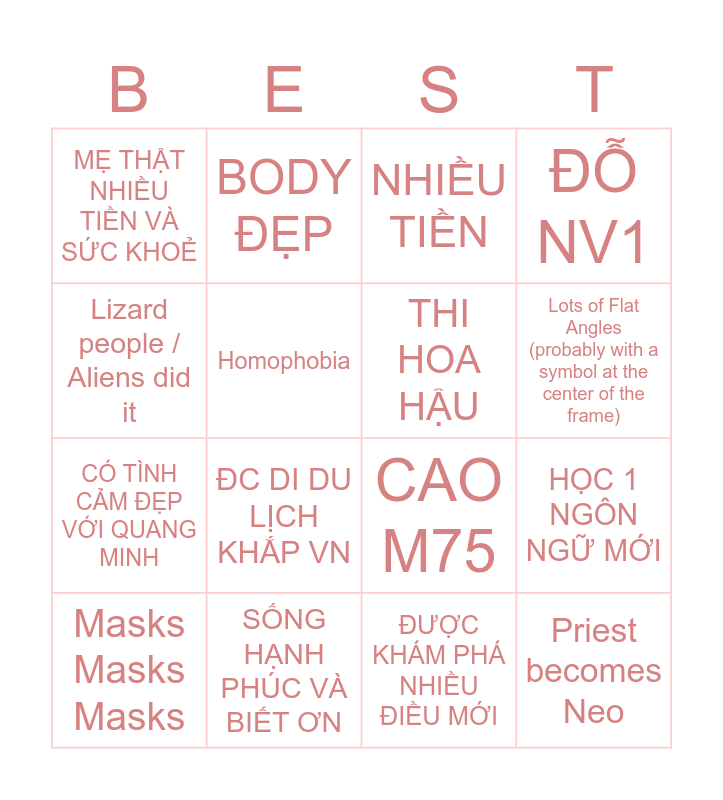 This bingo card has 25 words: GIẢI NHÌ HỌC SINH GIỎI QUỐC GIA VỚI SỐ TỜ LÀ 7 ĐẾN 8 TỜ VỚI SỐ ĐIỂM 15, GIẢI NHÌ HỌC SINH GIỎI THÀNH PHỐ ĐỊA LÍ NĂM NAY, CAO M75, VẺ ĐẸP TRI THỨC, MẸ THẬT NHIỀU TIỀN VÀ SỨC KHOẺ, BODY ĐẸP, NHIỀU TIỀN, ĐỖ NV1, CÓ TÌNH CẢM ĐẸP VỚI QUANG MINH, ĐC DI DU LỊCH KHẮP VN, ĐƯỢC KHÁM PHÁ NHIỀU ĐIỀU MỚI, HỌC 1 NGÔN NGỮ MỚI, DI CONCERT IDOL, SỐNG HẠNH PHÚC VÀ BIẾT ƠN, THI HOA HẬU, SUY NGHĨ TÍCH CỰC, Masks Masks Masks, Homophobia, Plan to Emasculate men, Priest becomes Neo, Lizard people / Aliens did it, Christian Holocaust, "The Abortion Scene", Lots of Flat Angles (probably with a symbol at the center of the frame) and Prayer War.
