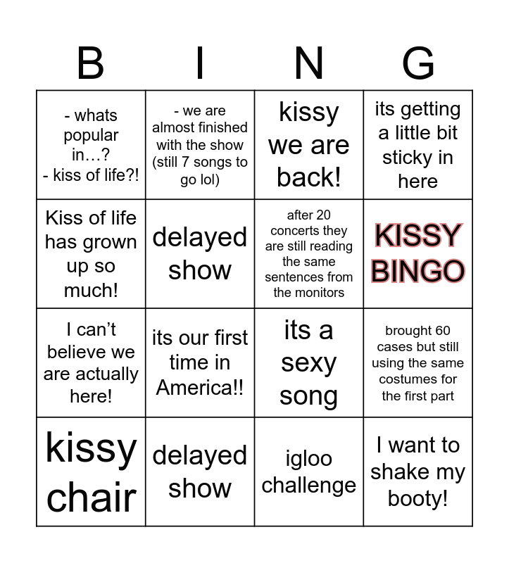 This bingo card has 18 words: its our first time in America!!, I want to shake my booty!, kissy we are back!, - whats popular in…? - kiss of life?!, its a sexy song, its getting a little bit sticky in here, kissy chair, - we are almost finished with the show (still 7 songs to go lol), KISSY BINGO, I can’t believe we are actually here!, igloo challenge, Kiss of life has grown up so much!, brought 60 cases but still using the same costumes for the first part, delayed show, after 20 concerts they are still reading the same sentences from the monitors, Go Natty!, delayed show and igloo challenge.