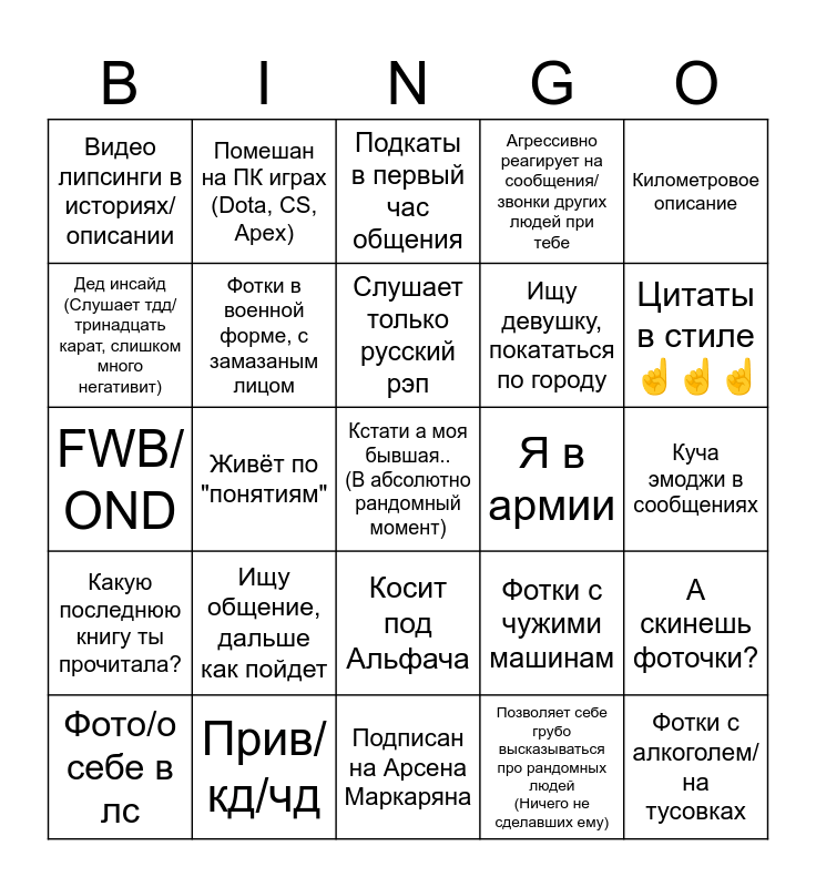 This bingo card has 25 words: Ищу общение, дальше как пойдет, Подписан на Арсена Маркаряна, Слушает только русский рэп, Фото/о себе в лс, Километровое описание, Видео липсинги в историях/описании, Дед инсайд (Слушает тдд/тринадцать карат, слишком много негативит), Помешан на ПК играх (Dota, CS, Apex), Я в армии, Косит под Альфача, Ищу девушку, покататься по городу, FWB/ OND, Фотки с чужими машинам, А скинешь фоточки?, Фотки в военной форме, с замазаным лицом, Фотки с алкоголем/на тусовках, Куча эмоджи в сообщениях, Подкаты в первый час общения, Цитаты в стиле ☝☝☝, Живёт по "понятиям", Кстати а моя бывшая.. (В абсолютно рандомный момент), Прив/кд/чд, Какую последнюю книгу ты прочитала?, Агрессивно реагирует на сообщения/звонки других людей при тебе and Позволяет себе грубо высказываться про рандомных людей (Ничего не сделавших ему).