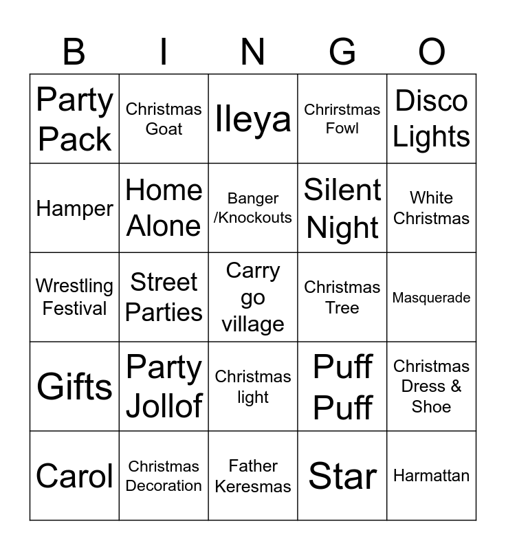 This bingo card has 25 words: Party Jollof, Father Keresmas, Banger /Knockouts, Carol, Disco Lights, Party Pack, Hamper, Christmas Goat, Christmas Tree, Christmas light, Silent Night, Wrestling Festival, Puff Puff, Christmas Dress & Shoe, Home Alone, Harmattan, Masquerade, Ileya, White Christmas, Street Parties, Carry go village, Christmas Decoration, Gifts, Chrirstmas Fowl and Star.
