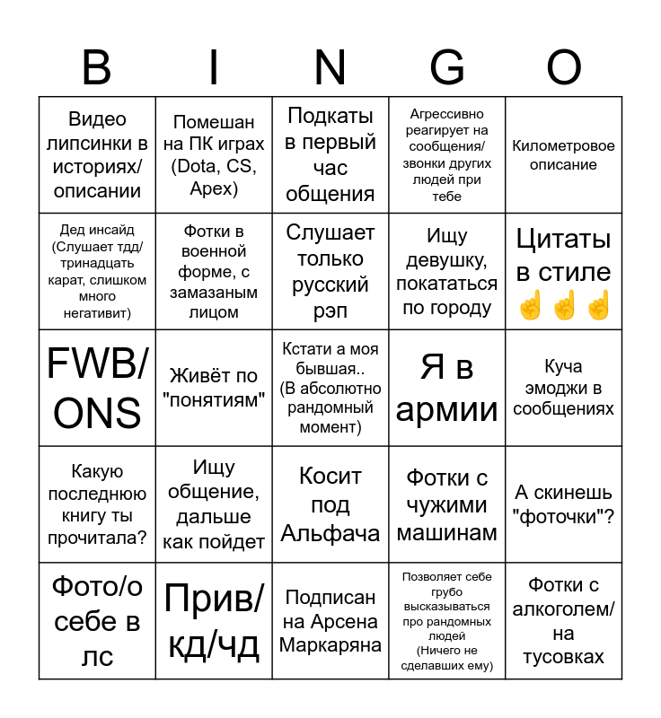 This bingo card has 25 words: Ищу общение, дальше как пойдет, Подписан на Арсена Маркаряна, Слушает только русский рэп, Фото/о себе в лс, Километровое описание, Видео липсинки в историях/описании, Дед инсайд (Слушает тдд/тринадцать карат, слишком много негативит), Помешан на ПК играх (Dota, CS, Apex), Я в армии, Косит под Альфача, Ищу девушку, покататься по городу, FWB/ ONS, Фотки с чужими машинам, А скинешь "фоточки"?, Фотки в военной форме, с замазаным лицом, Фотки с алкоголем/на тусовках, Куча эмоджи в сообщениях, Подкаты в первый час общения, Цитаты в стиле ☝☝☝, Живёт по "понятиям", Кстати а моя бывшая.. (В абсолютно рандомный момент), Прив/кд/чд, Какую последнюю книгу ты прочитала?, Агрессивно реагирует на сообщения/звонки других людей при тебе and Позволяет себе грубо высказываться про рандомных людей (Ничего не сделавших ему).