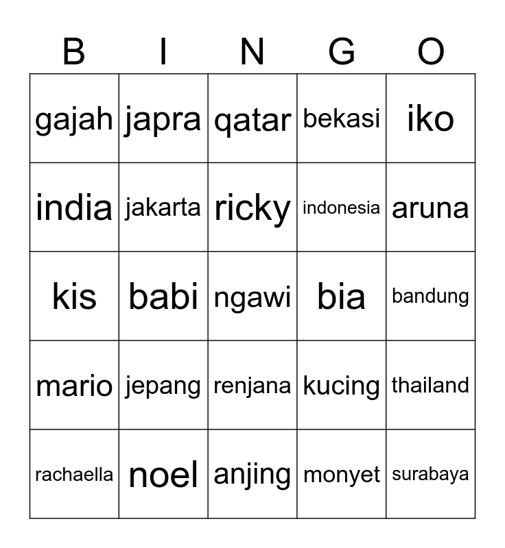 This bingo card has a free space and 24 words: rachaella, jepang, ricky, monyet, iko, gajah, japra, qatar, bia, bandung, kis, jakarta, kucing, thailand, india, noel, anjing, bekasi, aruna, mario, babi, renjana, indonesia and surabaya.