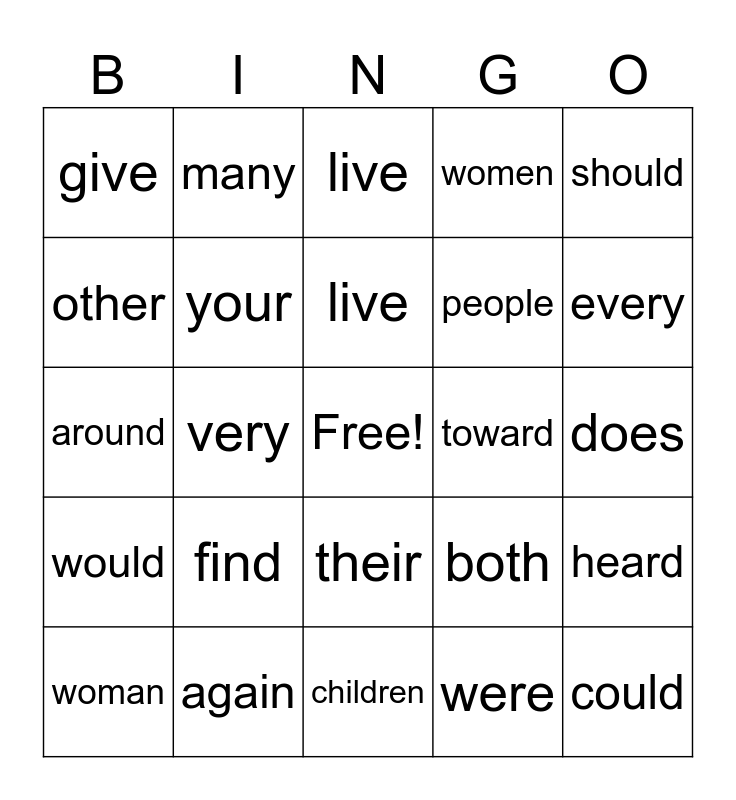 This bingo card has a free space and 24 words: find, again, live, woman, should, give, other, many, toward, their, people, around, both, heard, your, were, does, live, every, very, could, would, women and children.