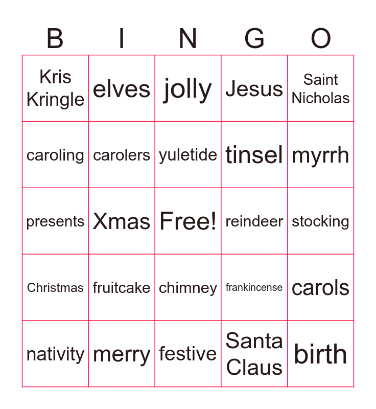 This bingo card has a free space and 25 words: Christmas, merry, festive, Santa Claus, Saint Nicholas, Kris Kringle, elves, jolly, reindeer, carols, caroling, carolers, mistletoe, frankincense, myrrh, nativity, Xmas, yuletide, tinsel, stocking, presents, fruitcake, chimney, Jesus and birth.
