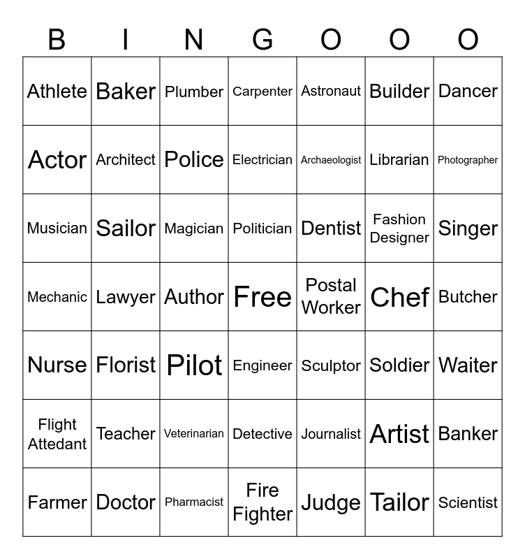 This bingo card has a free space and 48 words: Journalist, Librarian, Fire Fighter, Lawyer, Magician, Butcher, Baker, Doctor, Builder, Engineer, Dancer, Carpenter, Fashion Designer, Dentist, Flight Attedant, Chef, Actor, Photographer, Artist, Astronaut, Archaeologist, Author, Athlete, Architect, Banker, Police, Singer, Farmer, Politician, Sailor, Tailor, Postal Worker, Waiter, Teacher, Mechanic, Sculptor, Soldier, Musician, Pilot, Veterinarian, Nurse, Scientist, Plumber, Pharmacist, Electrician, Detective, Florist and Judge.