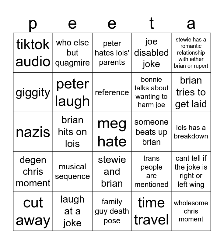 This bingo card has a free space and 24 words: musical sequence, laugh at a joke, reference, cut away, stewie has a romantic relationship with either brian or rupert, tiktok audio, giggity, who else but quagmire, someone beats up brian, stewie and brian, bonnie talks about wanting to harm joe, nazis, trans people are mentioned, cant tell if the joke is right or left wing, peter laugh, time travel, lois has a breakdown, peter hates lois' parents, brian tries to get laid, brian hits on lois, wholesome chris moment, degen chris moment, joe disabled joke and family guy death pose.