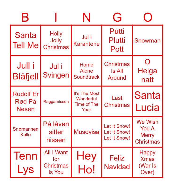 This bingo card has 30 words: All I Want for Christmas Is You, Jingle Bell Rock, Raggarnissen, Fairytale of New York, Santa Tell Me, Jul i Karantene, Jul i Svingen, Musevisa, Last Christmas, Hey Ho!, Santa Lucia, It's The Most Wonderful Time of The Year, Feliz Navidad, Happy Xmas (War Is Over), O Helga natt, Rockin' Around The Christmas Tree, Let It Snow! Let It Snow! Let It Snow!, Snømannen Kalle, På låven sitter nissen, Snowman, Rudolf Er Rød På Nesen, The Støvel Dance, Holly Jolly Christmas, Christmas Is All Around, Jull i Blåfjell, Putti Plutti Pott, We Wish You A Merry Christmas, Tenn Lys, Home Alone Soundtrack and White Christmas.