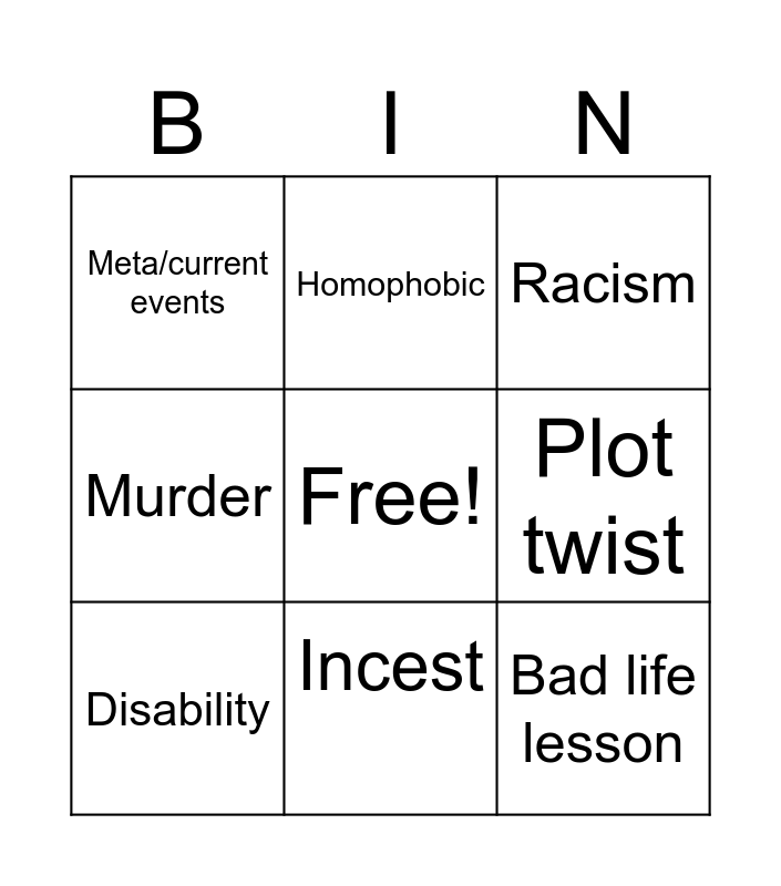 This bingo card has a free space and 8 words: Plot twist, Racism, Homophobic, Disability, Meta/current events, Bad life lesson, Murder and Incest.