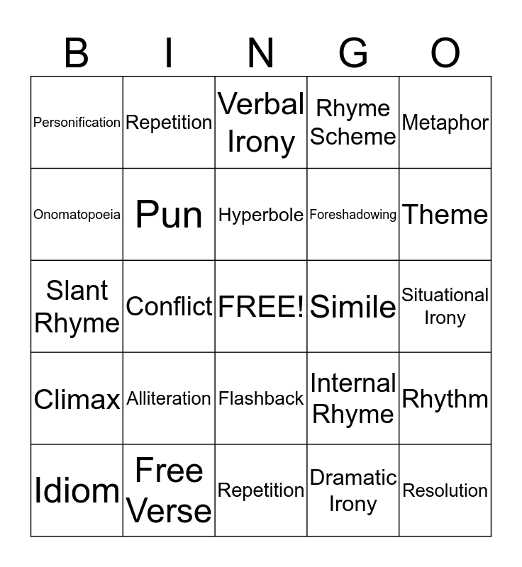 This bingo card has a free space and 24 words: Alliteration, Free Verse, Hyperbole, Idiom, Metaphor, Personification, Onomatopoeia, Repetition, Simile, Flashback, Foreshadowing, Slant Rhyme, Internal Rhyme, Rhythm, Pun, Dramatic Irony, Situational Irony, Verbal Irony, Theme, Conflict, Resolution, Climax, Rhyme Scheme and Repetition.
