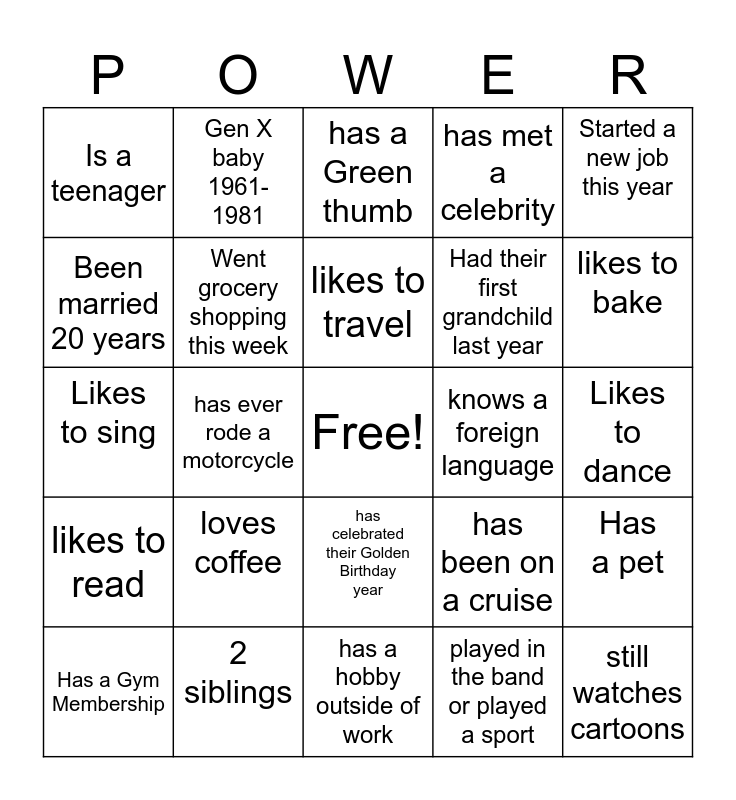This bingo card has a free space and 24 words: loves coffee, 2 siblings, likes to travel, Has a Gym Membership, Started a new job this year, Is a teenager, Been married 20 years, Gen X baby 1961-1981, knows a foreign language, has celebrated their Golden Birthday year, Had their first grandchild last year, Likes to sing, has been on a cruise, Has a pet, Went grocery shopping this week, played in the band or played a sport, Likes to dance, has a Green thumb, likes to bake, has ever rode a motorcycle, still watches cartoons, likes to read, has met a celebrity and has a hobby outside of work.