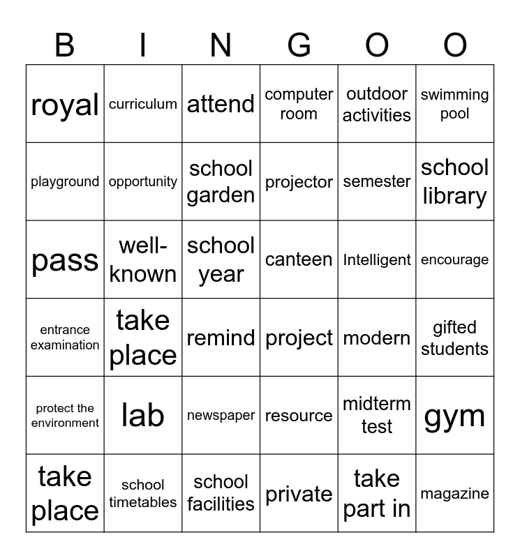 This bingo card has 36 words: resource, newspaper, private, playground, entrance examination, canteen, opportunity, school facilities, outdoor activities, midterm test, school library, computer room, gym, well-known, projector, royal, protect the environment, Intelligent, pass, attend, school year, take place, project, remind, modern, curriculum, semester, school timetables, school garden, swimming pool, magazine, take place, gifted students, encourage, lab and take part in.