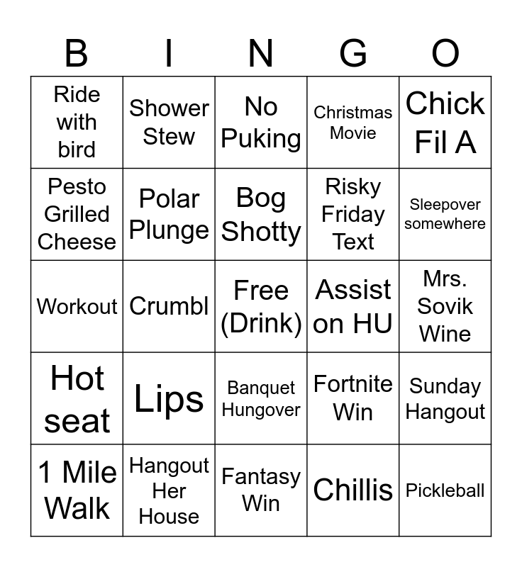 This bingo card has a free space and 24 words: 1 Mile Walk, Lips, Bog Shotty, Chillis, Chick Fil A, Ride with bird, Shower Stew, No Puking, Assist on HU, Mrs. Sovik Wine, Workout, Polar Plunge, Fortnite Win, Sunday Hangout, Pesto Grilled Cheese, Hangout Her House, Fantasy Win, Christmas Movie, Sleepover somewhere, Hot seat, Crumbl, Banquet Hungover, Risky Friday Text and Pickleball.