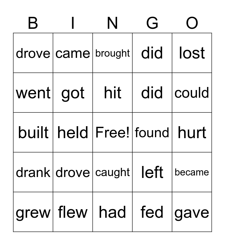This bingo card has a free space and 28 words: became, chose, did, fed, went, brought, came, drank, found, grew, built, did, flew, had, could, drank, drove, got, hit, caught, drove, ate, gave, held, hurt, left, lost and made.