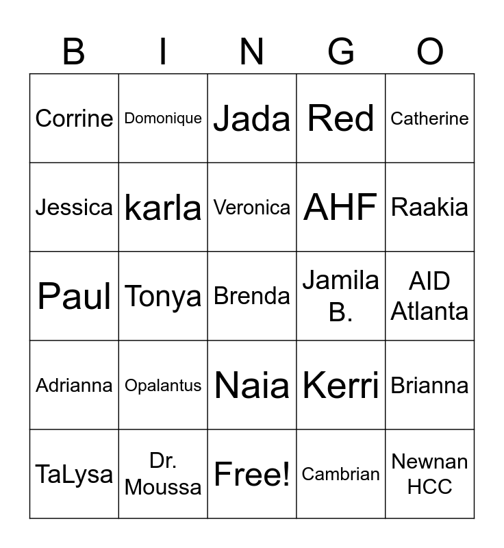 This bingo card has 25 words: Adrianna, Dr. Moussa, Brenda, Cambrian, Catherine, Corrine, Domonique, Jada, Jamila B., Brianna, Jessica, karla, Free!, Kerri, Raakia, TaLysa, Tonya, Veronica, AHF, AID Atlanta, Paul, Opalantus, Naia, Red and Newnan HCC.