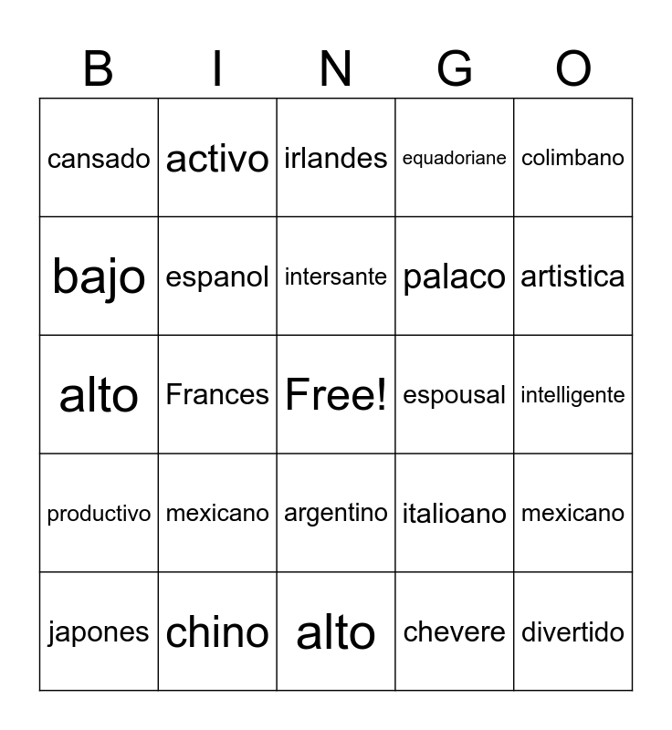 This bingo card has a free space and 24 words: mexicano, chino, intersante, japones, colimbano, cansado, bajo, activo, espousal, argentino, palaco, alto, italioano, mexicano, espanol, chevere, intelligente, irlandes, artistica, Frances, divertido, productivo, equadoriane and alto.