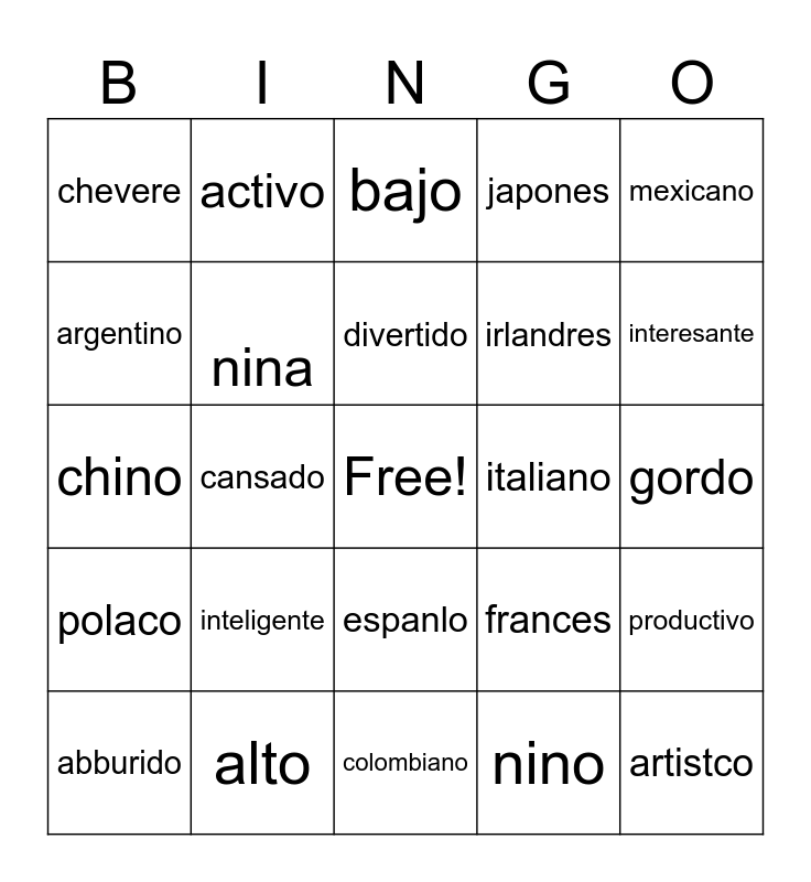 This bingo card has a free space and 24 words: inteligente, alto, divertido, abburido, mexicano, chevere, argentino, activo, italiano, espanlo, irlandres, chino, frances, productivo, nina, nino, gordo, bajo, interesante, cansado, artistco, polaco, japones and colombiano.