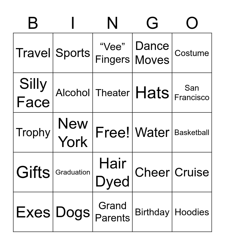This bingo card has a free space and 24 words: Graduation, Dogs, Theater, Exes, Costume, Travel, Silly Face, Sports, Water, Hair Dyed, Hats, Trophy, Cheer, Cruise, Alcohol, Birthday, Basketball, “Vee” Fingers, San Francisco, New York, Hoodies, Gifts, Dance Moves and Grand Parents.