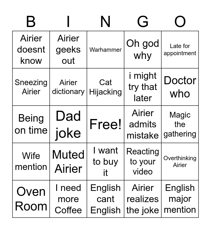This bingo card has a free space and 24 words: Muted Airier, I need more Coffee, Cat Hijacking, Oven Room, Late for appointment, Airier doesnt know, Sneezing Airier, Airier geeks out, Airier admits mistake, I want to buy it, i might try that later, Being on time, Reacting to your video, Overthinking Airier, Airier dictionary, Airier realizes the joke, Magic the gathering, Warhammer, Doctor who, Dad joke, English major mention, Wife mention, Oh god why and English cant English.