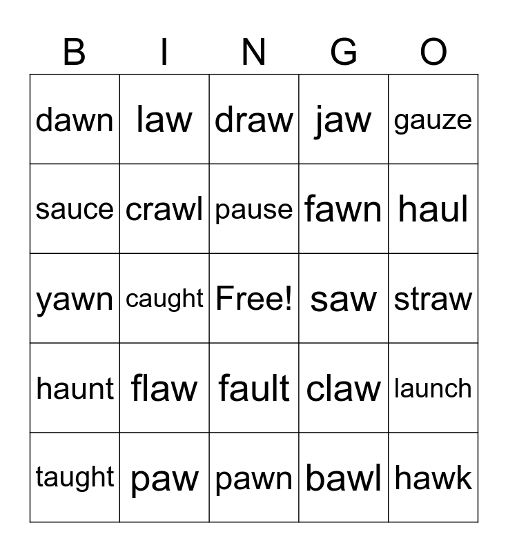 This bingo card has a free space and 24 words: flaw, paw, pause, taught, gauze, dawn, sauce, law, saw, fault, fawn, yawn, claw, launch, crawl, bawl, straw, draw, haul, caught, hawk, haunt, jaw and pawn.