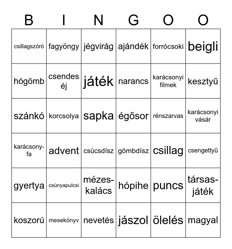 This bingo card has 36 words: hópihe, mézes-kalács, jászol, hógömb, karácsony-fa, égősor, csendes éj, nevetés, forrócsoki, puncs, kesztyű, ajándék, társas-játék, korcsolya, narancs, csillagszóró, gyertya, rénszarvas, szánkó, jégvirág, sapka, advent, gömbdísz, csúcsdísz, csillag, fagyöngy, karácsonyi filmek, mesekönyv, játék, beigli, magyal, koszorú, csengettyű, karácsonyi vásár, csúnyapulcsi and ölelés.