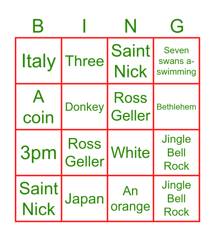 This bingo card has 22 words: Japan, A coin, Three, Bethlehem, Donkey, Ross Geller, Italy, Saint Nick, White, Jingle Bell Rock, 3pm, Seven swans a-swimming, 5th of January, The Nutcracker, An orange, An angel, Jingle Bell Rock, Saint Nick, Ross Geller, A coin, Bethlehem and 5th of January.