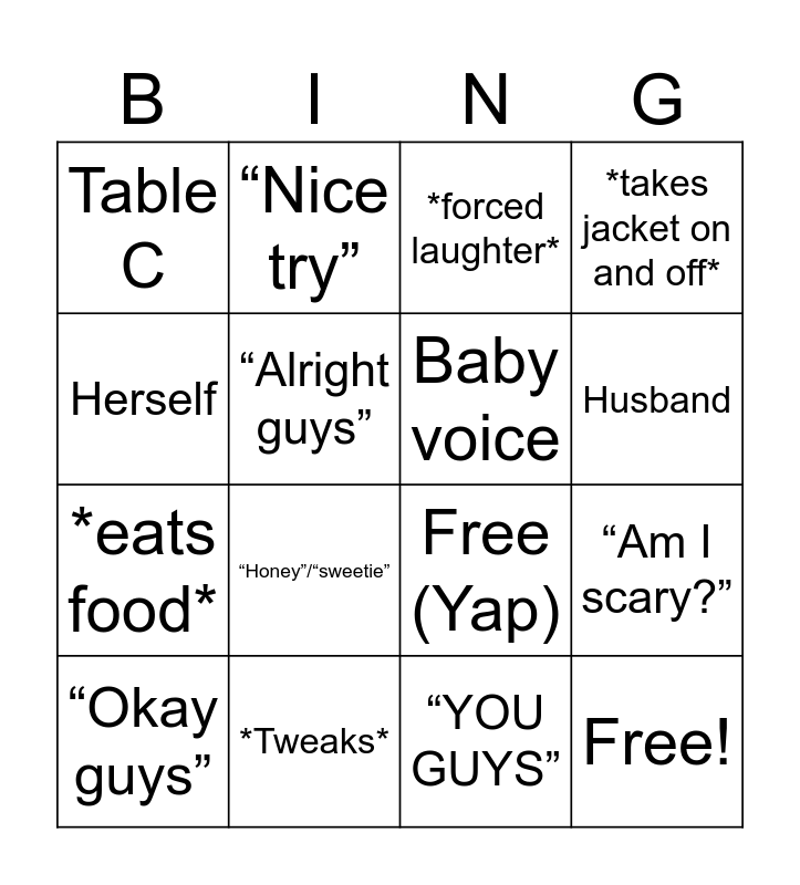 This bingo card has 23 words: Free!, “If u have any questions just ask” *gets mad*, Husband, Kids/Family, Herself, Table C, “Alright guys”, “Nice try”, “Okay guys”, Racism, “Honey”/“sweetie”, *eats food*, *mad bc we didnt do lab fast enough*, *glazes*, *Tweaks*, “Sooooo…”, *forced laughter*, Free (Yap), Baby voice, “Am I scary?”, *takes jacket on and off*, “YOU GUYS” and “Cmon guys talk to me i cant read your mind”.